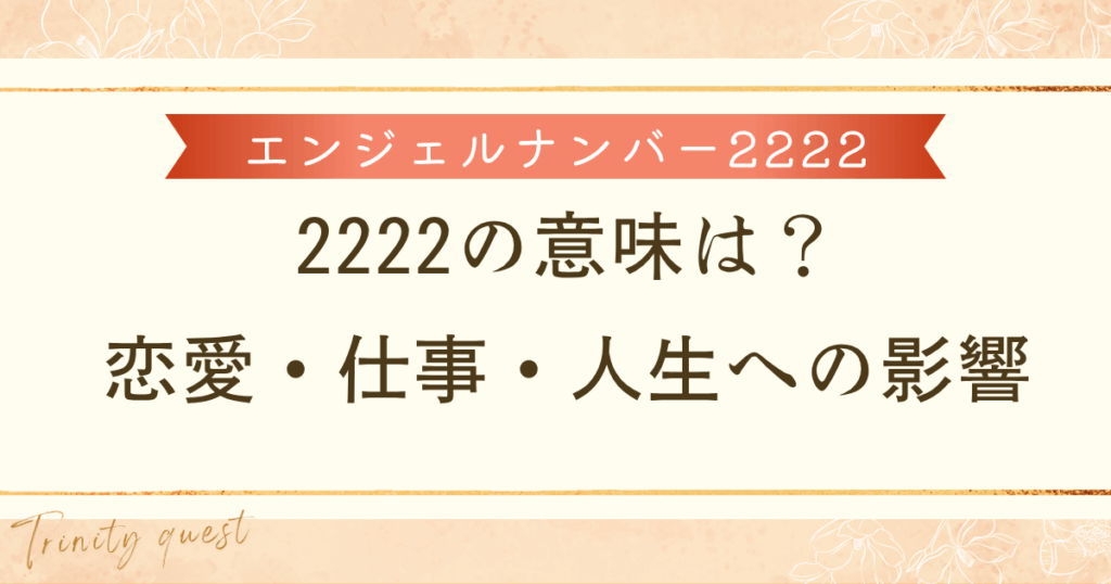 「なぜか最近、2222という数字ばかり目にする…」そんな不思議な体験をしたことはありませんか。生きる意味を見失ったり孤独感に揺れるとき、この数字は心に寄り添うやさしいサインだと考えられています。本記事では、2222エンジェルナンバーの基本的な意味... -